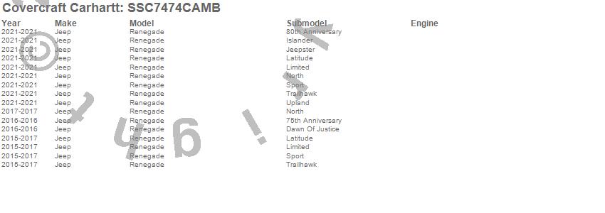 Below is an abbreviated list of applications for the Covercraft Carhartt SeatSaver.Renegade, Jeep, 2021, 2020, 2019, 2018, 2017, 2016, 2015