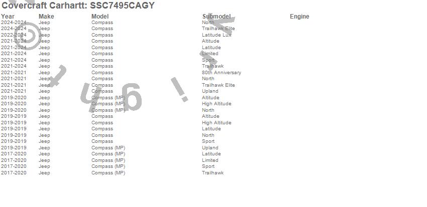 Below is an abbreviated list of applications for the Covercraft Carhartt SeatSaver.Compass, Jeep, 2025, 2024, 2023, 2022, 2021, 2020, 2019, 2018, 2017