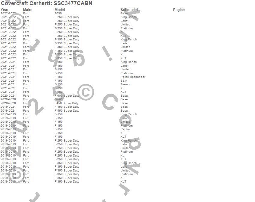 Below is an abbreviated list of applications for the Covercraft Carhartt SeatSaver.F-150, F-250 Super Duty, F-350 Super Duty, F-450 Super Duty, F-550 Super Duty, F-600, F-600 Super Duty, F650, Ford, 2022, 2021, 2020, 2019