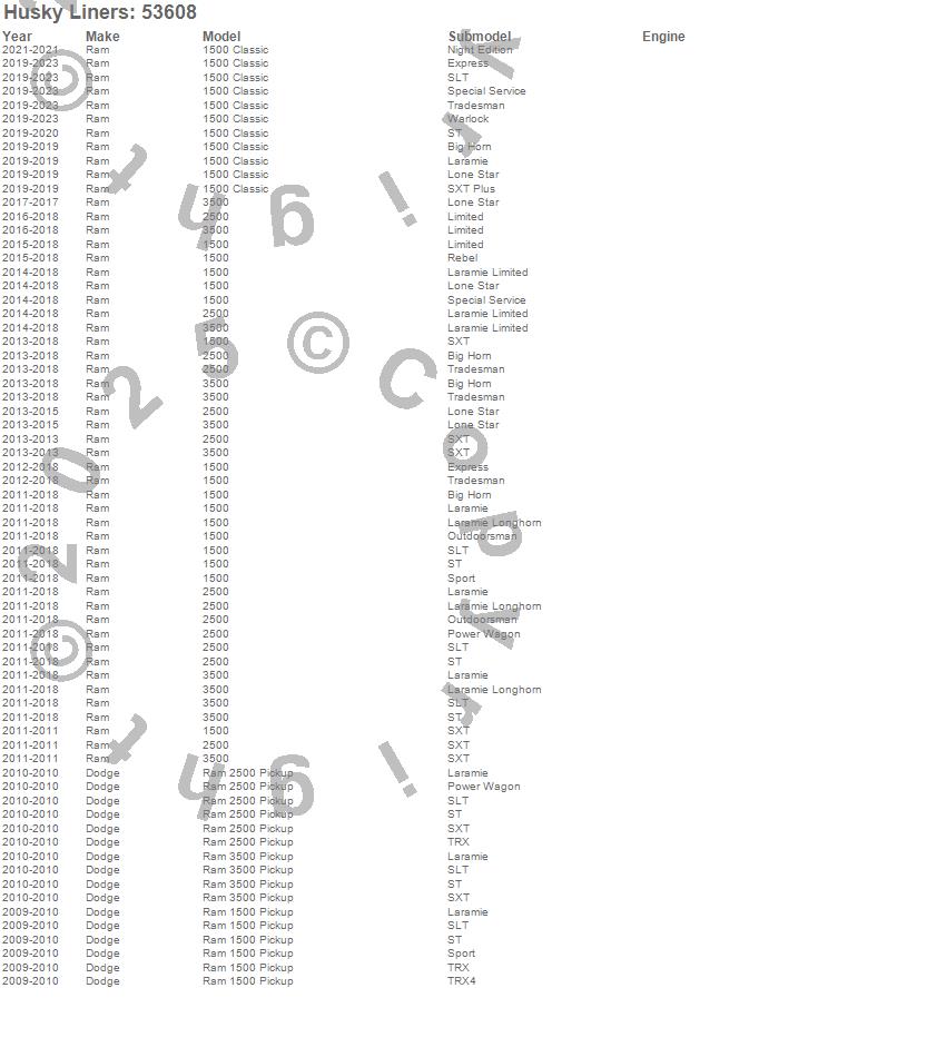 Below is an abbreviated list of applications for the X-act Contour Floor Liner.1500, 1500 Classic, 2500, 3500, Ram 1500, Ram 2500, Ram 3500, Dodge, Ram, 2024, 2023, 2022, 2021, 2020, 2019, 2018, 2017, 2016, 2015, 2014