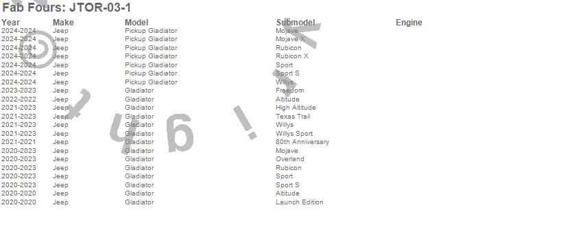 Brand: Fab FoursPart Number: JTOR-03-1Roof Rack Type: 2 Stage Black Powder Coat - w/CrossmemberUPC: 005810120344