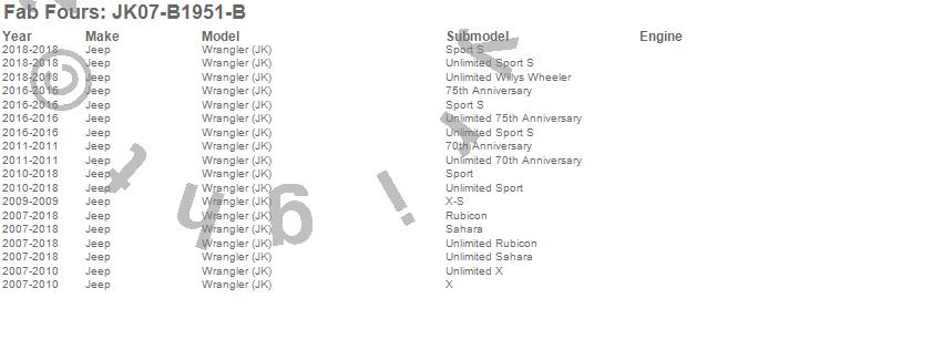Below is an abbreviated list of applications for the Stubby Bumper.Wrangler (JK), Jeep, 2018, 2017, 2016, 2015, 2014, 2013, 2012, 2011, 2010, 2009, 2008, 2007