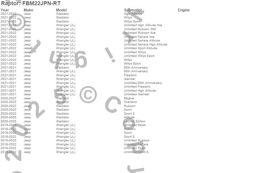 Brand: RaptorPart Number: FBM22JPN-RTBumper- Front Type: w/RT-Series Light Bracket - No Parking Sensor - Incl. Skid PlateUPC: 813443029640