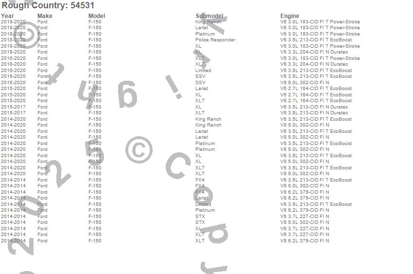 Brand: Rough CountryPart Number: 54531Lift Kit-Suspension w/Shock Type: 3 in. - Tubular Upper Control Arms - Cleveite Rubber Bushings - Fabricated Rear Blocks - Includes N3 Lifted Struts - Nitrogen Charged Shocks AbsorbersUPC: 843030160616