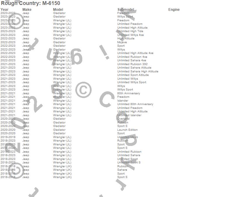 Brand: Rough CountryPart Number: M-6150Floor Mat Set Type: Front - Semi Flexible Black Series - Made Of Ultra Durable Polyethylene - Textured Surface - PairUPC: 843030158828