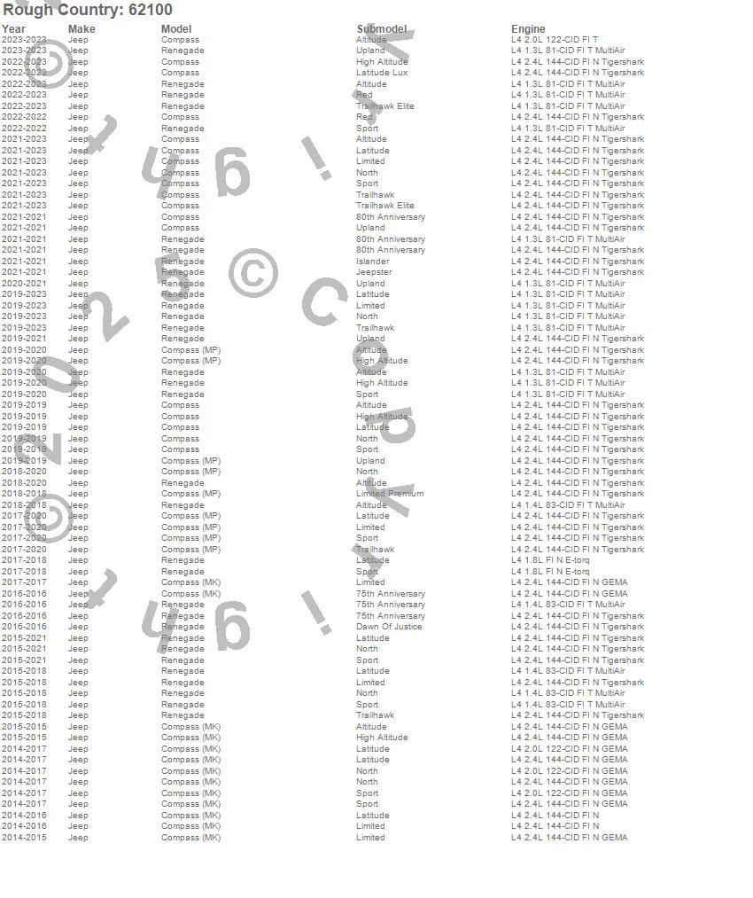 Below is an abbreviated list of applications for the Suspension Lift Kit.Compass, Renegade, Jeep, 2023, 2022, 2021, 2020, 2019, 2018, 2017, 2016, 2015, 2014