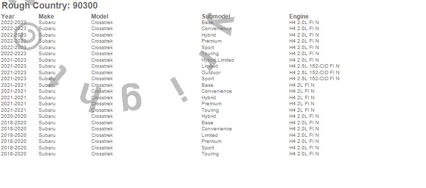 Below is an abbreviated list of applications for the Suspension Lift.Crosstrek, Subaru, 2023, 2022, 2021, 2020, 2019, 2018