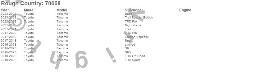 Below is an abbreviated list of applications for the LED Bumper Kit.Tacoma, Toyota, 2023, 2022, 2021, 2020, 2019, 2018, 2017, 2016