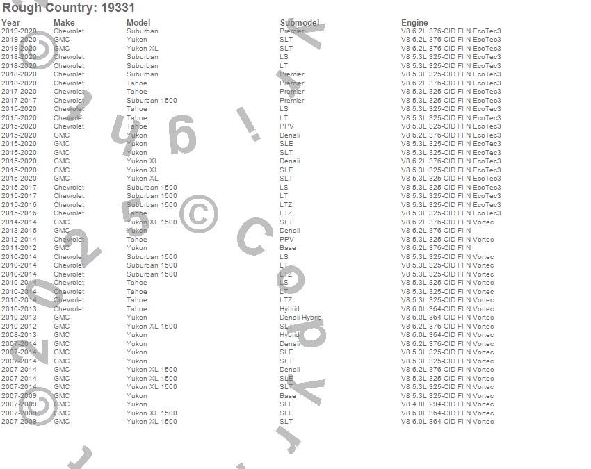 Below is an abbreviated list of applications for the Suspension Lift Kit.Suburban, Suburban 1500, Tahoe, Yukon, Yukon XL, Yukon XL 1500, Chevrolet, GMC, 2020, 2019, 2018, 2017, 2016, 2015, 2014, 2013, 2012, 2011, 2010, 2009