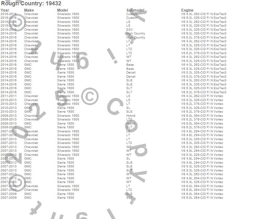 Below is an abbreviated list of applications for the Suspension Lift Kit.Sierra 1500, Silverado 1500, Chevrolet, GMC, 2016, 2015, 2014, 2013, 2012, 2011, 2010, 2009, 2008, 2007