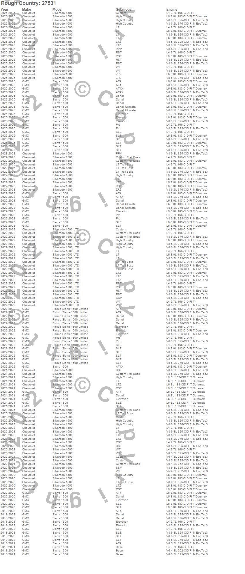 Below is an abbreviated list of applications for the Suspension Lift Kit.Pickup Sierra 1500 Limited, Sierra 1500, Silverado 1500, Silverado 1500 LTD, Chevrolet, GMC, 2025, 2024, 2023, 2022, 2021, 2020, 2019