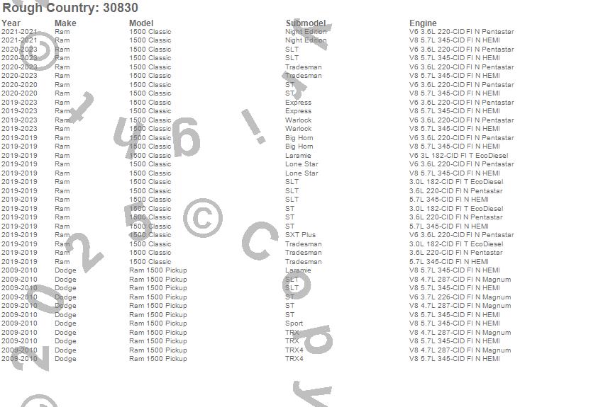 Below is an abbreviated list of applications for the Suspension Lift Kit.1500 Classic, Ram 1500, Dodge, Ram, 2023, 2022, 2021, 2020, 2019, 2010, 2009