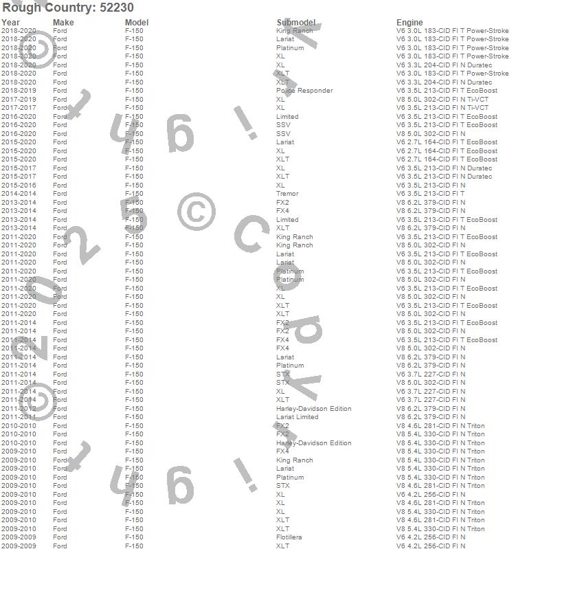 Below is an abbreviated list of applications for the Suspension Lift Kit.F-150, Ford, 2020, 2019, 2018, 2017, 2016, 2015, 2014, 2013, 2012, 2011, 2010, 2009