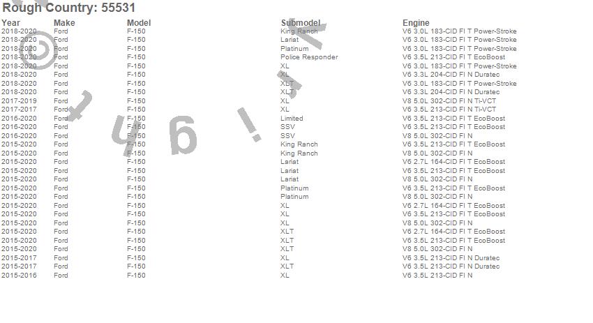 Below is an abbreviated list of applications for the Suspension Lift Kit.F-150, Ford, 2020, 2019, 2018, 2017, 2016, 2015
