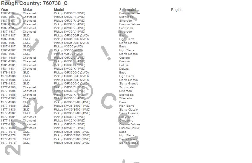 Below is an abbreviated list of applications for the V2 Shock Absorbers.C30 Pickup, C35/C3500 Pickup, C3500 Pickup, K30 Pickup, K35 Pickup, K3500 Pickup, R30 Pickup, R3500 Pickup, V30 Pickup, V3500 Pickup, Chevrolet, GMC, 1987, 1986, 1985, 1984, 1983, 1982, 1981, 1980