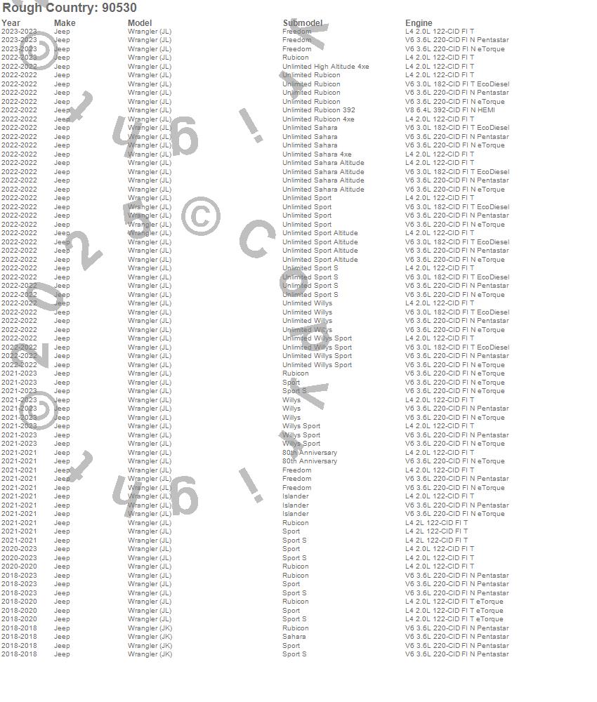 Below is an abbreviated list of applications for the Suspension Lift Kit.Wrangler (JK), Wrangler (JL), Jeep, 2023, 2022, 2021, 2020, 2019, 2018