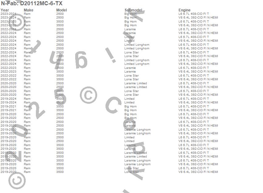 Brand: N-FabPart Number: D20112MC-6-TXNerf/Step Bar (Wheel to Wheel) Type: 3 in. Main Tube - 3 Step - Textured BlackUPC: 843206125920