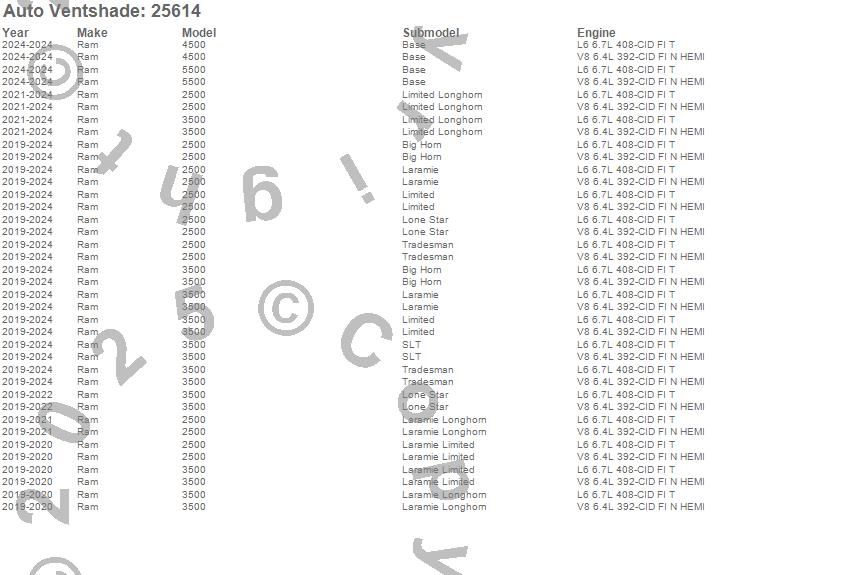 Below is an abbreviated list of applications for the Bugflector II Stone/Bug Deflector.2500, 3500, 4500, 5500, Ram, 2025, 2024, 2023, 2022, 2021, 2020, 2019