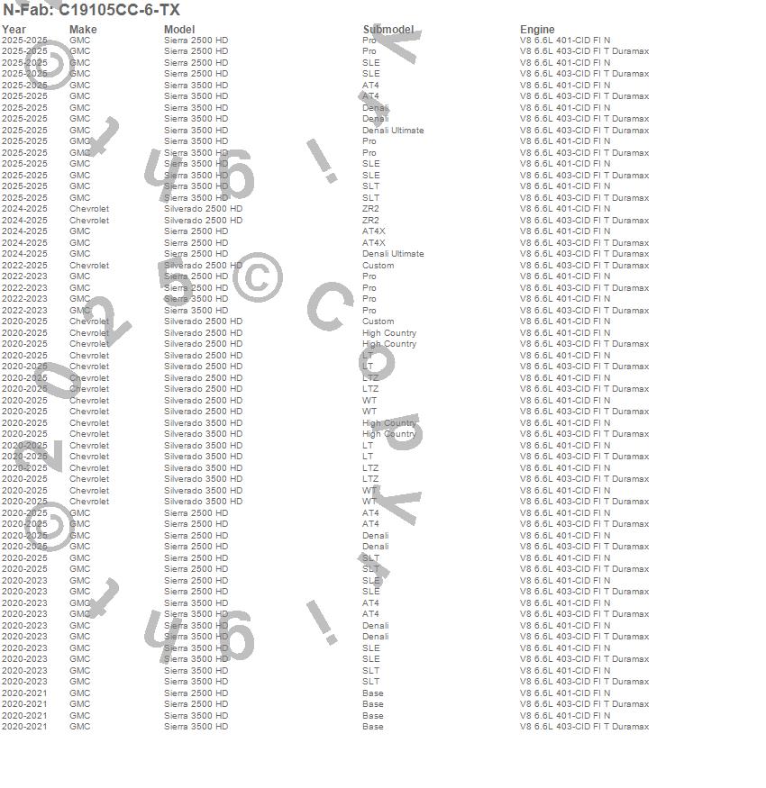 Below is an abbreviated list of applications for the Wheel To Wheel Nerf Step Bar w/Bed Access.Sierra 2500 HD, Sierra 3500 HD, Silverado 2500 HD, Silverado 3500 HD, Chevrolet, GMC, 2026, 2025, 2024, 2023, 2022, 2021, 2020