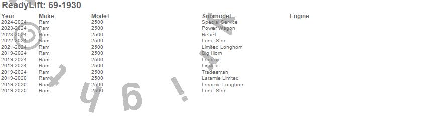 Brand: ReadyLiftPart Number: 69-1930Lift Kit-Suspension Type: 3 in. Front/2 in. Rear LiftUPC: 804879610403