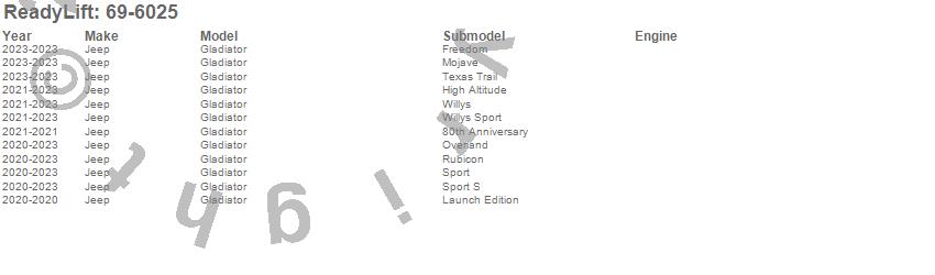 Brand: ReadyLiftPart Number: 69-6025Lift Kit-Suspension Type: 2.5 in. Front/2 in. Rear LiftUPC: 804879610526