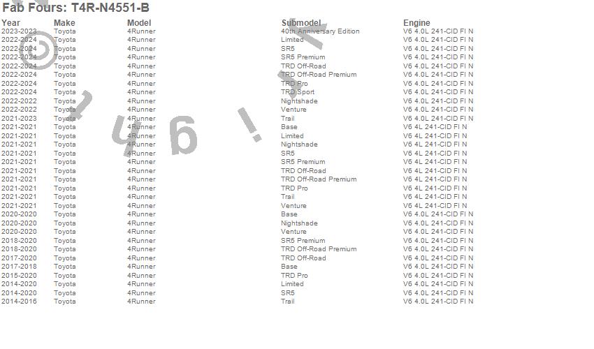Below is an abbreviated list of applications for the Winch Mount.4Runner, Toyota, 2024, 2023, 2022, 2021, 2020, 2019, 2018, 2017, 2016, 2015, 2014