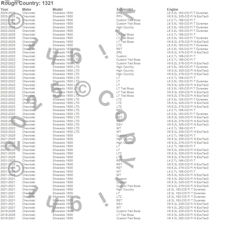 Below is an abbreviated list of applications for the Leveling Lift Kit.Silverado 1500, Silverado 1500 LTD, Chevrolet, 2025, 2024, 2023, 2022, 2021, 2020, 2019