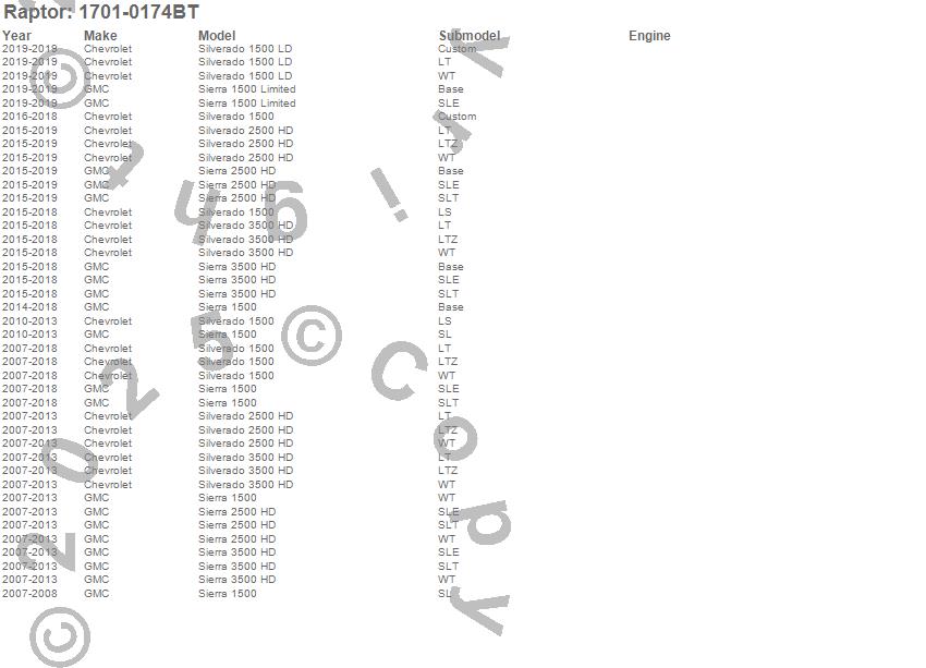 Brand: RaptorPart Number: 1701-0174BTRunning Board Type: 6 in. - Rocker Panel Mount - Black Textured - Incl. Brackets PN[RB-0103-BK]UPC: 813443026038