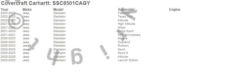 Below is an abbreviated list of applications for the Covercraft Carhartt SeatSaver.Gladiator, Pickup Gladiator, Jeep, 2025, 2024, 2023, 2022, 2021, 2020
