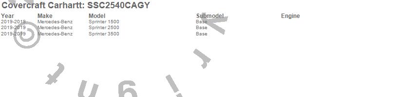 Below is an abbreviated list of applications for the Covercraft Carhartt SeatSaver.Sprinter 1500, Sprinter 2500, Sprinter 3500, Sprinter 3500XD, Mercedes-Benz, 2025, 2024, 2023, 2022, 2021, 2020, 2019