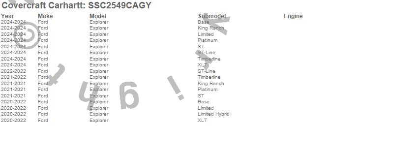 Below is an abbreviated list of applications for the Covercraft Carhartt SeatSaver.Explorer, Ford, 2024, 2023, 2022, 2021, 2020