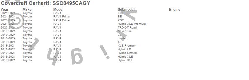 Below is an abbreviated list of applications for the Covercraft Carhartt SeatSaver.RAV4, RAV4 Prime, Toyota, 2025, 2024, 2023, 2022, 2021, 2020, 2019