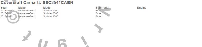 Below is an abbreviated list of applications for the Covercraft Carhartt SeatSaver.Sprinter 1500, Sprinter 2500, Sprinter 3500, Sprinter 3500XD, Mercedes-Benz, 2025, 2024, 2023, 2022, 2021, 2020, 2019