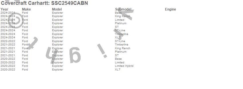 Below is an abbreviated list of applications for the Covercraft Carhartt SeatSaver.Explorer, Ford, 2024, 2023, 2022, 2021, 2020