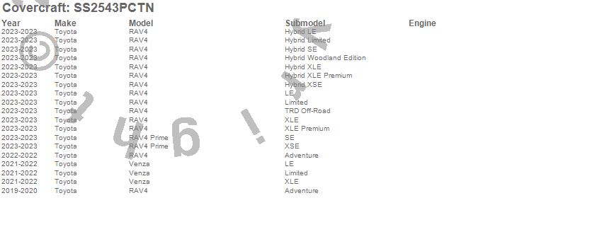 Below is an abbreviated list of applications for the SeatSaver Custom Seat Cover.RAV4, RAV4 Prime, Venza, Toyota, 2025, 2024, 2023, 2022, 2021, 2020, 2019
