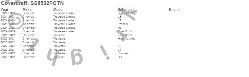Below is an abbreviated list of applications for the SeatSaver Custom Seat Cover.Traverse, Traverse Limited, Chevrolet, 2024, 2021, 2020