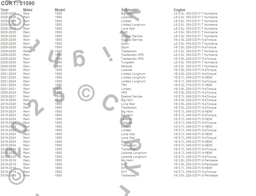 Brand: CURTPart Number: 31090Trailer Hitch Type: 5000lbs. Gross Trailer Weight - 500lbs. Tongue WeightUPC: 612314310906