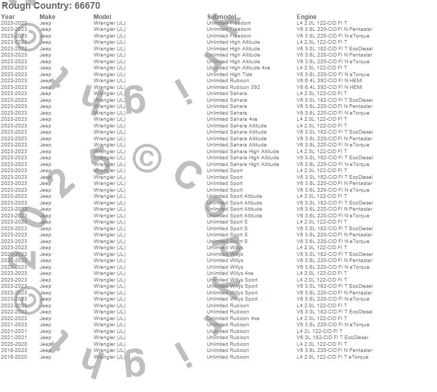 Brand: Rough CountryPart Number: 66670Lift Kit-Suspension w/Shock Type: 2.5 in. Lift - Rubicon - Incl. Coil Springs - V2 Monotube ShocksUPC: 843030198534