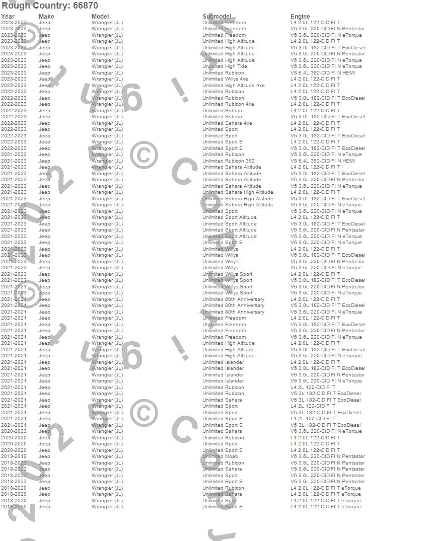 Below is an abbreviated list of applications for the Suspension Lift Kit w/Shocks.Wrangler (JL), Jeep, 2023, 2022, 2021, 2020, 2019, 2018