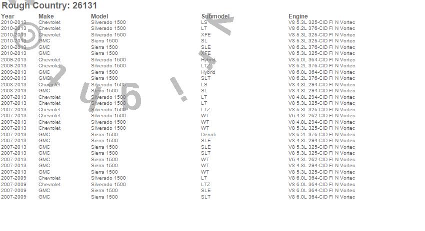 Below is an abbreviated list of applications for the Suspension Lift Kit w/Shocks.Sierra 1500, Silverado 1500, Chevrolet, GMC, 2013, 2012, 2011, 2010, 2009, 2008, 2007