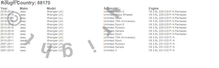Below is an abbreviated list of applications for the Suspension Lift Kit w/Shocks.Wrangler (JK), Wrangler (JL), Jeep, 2018, 2017, 2016, 2015, 2014, 2013, 2012, 2011, 2010, 2009, 2008, 2007