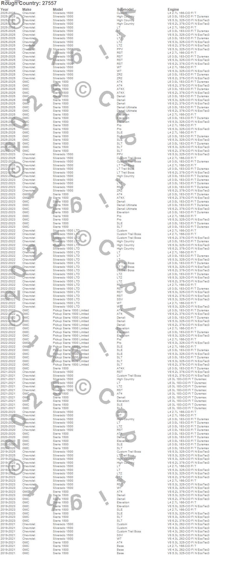 Below is an abbreviated list of applications for the Suspension Lift Kit w/Shocks.Pickup Sierra 1500 Limited, Sierra 1500, Silverado 1500, Silverado 1500 LTD, Chevrolet, GMC, 2025, 2024, 2023, 2022, 2021, 2020, 2019