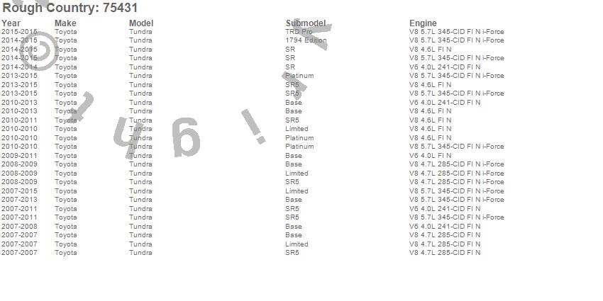 Below is an abbreviated list of applications for the Suspension Lift Kit w/Shocks.Tundra, Toyota, 2015, 2014, 2013, 2012, 2011, 2010, 2009, 2008, 2007