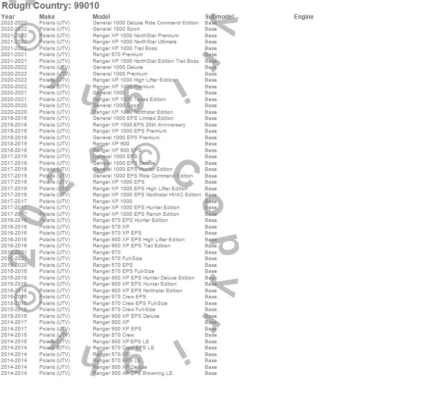 Below is an abbreviated list of applications for the Bed Tie-Down Kit.General 1000, General 1000 Deluxe, General 1000 Deluxe Ride Command Edition, General 1000 EPS, General 1000 EPS Deluxe, General 1000 EPS Hunter Edition, General 1000 EPS Limited Edition, General 1000 EPS Premium, General 1000 EPS Ride Command Edition, General 1000 Premium, General 1000 Sport, Ranger 570, Ranger 570 Crew, Ranger 570 Crew EPS, Ranger 570 Crew EPS Full-Size, Ranger 570 Crew EPS LE, Ranger 570 Crew Full-Size, Ranger 570 EFI, Ranger 570 EPS, Ranger 570 EPS Full-Size