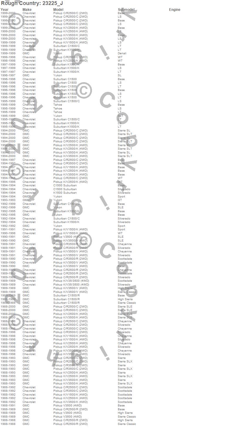 Below is an abbreviated list of applications for the N3 Shocks.C1500 Suburban, C2500 Pickup, C3500 Pickup, K1500 Pickup, K1500 Suburban, K2500 Pickup, K3500 Pickup, R2500 Pickup, R3500 Pickup, Tahoe, V3500 Pickup, Yukon, Chevrolet, GMC, 2000, 1999, 1998, 1997, 1996, 1995