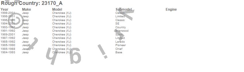 Below is an abbreviated list of applications for the N3 Shocks.Cherokee (XJ), Jeep, 2001, 2000, 1999, 1998, 1997, 1996, 1995, 1994, 1993, 1992, 1991, 1990, 1989, 1988, 1987, 1986, 1985, 1984