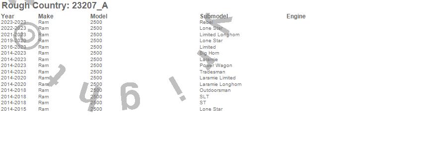 Brand: Rough CountryPart Number: 23207_AShock Absorber Type: Rear - 4.5-6 in. - 18 mm. Spring Loaded Piston Rod - 54 mm. Shock Body - 36 Kilonewton Tensile StrengthUPC: 843030180188