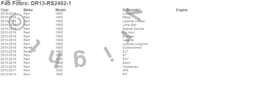 Brand: Fab FoursPart Number: DR13-RS2462-1Bumper- Front Type: w/Pre-Runner GuardUPC: 005810120849