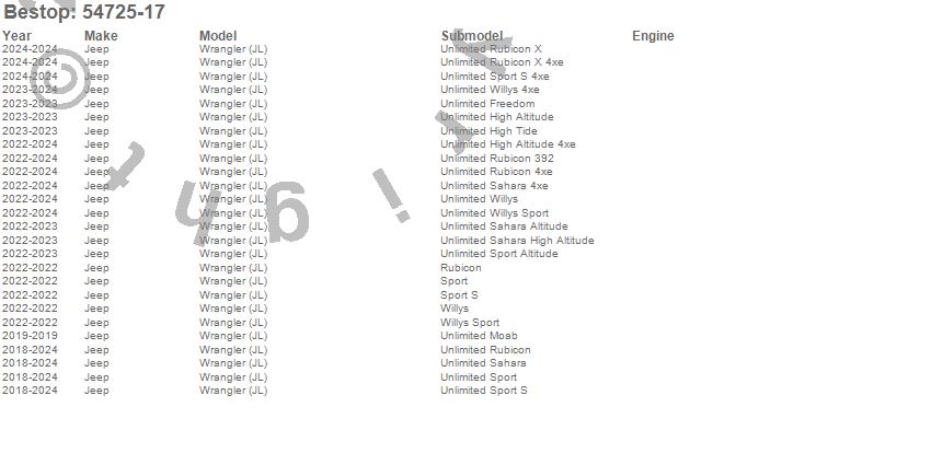Below is an abbreviated list of applications for the Supertop Ultra Squareback Soft Top.Wrangler, Wrangler (JL), Jeep, 2026, 2025, 2024, 2023, 2022, 2021, 2020, 2019, 2018