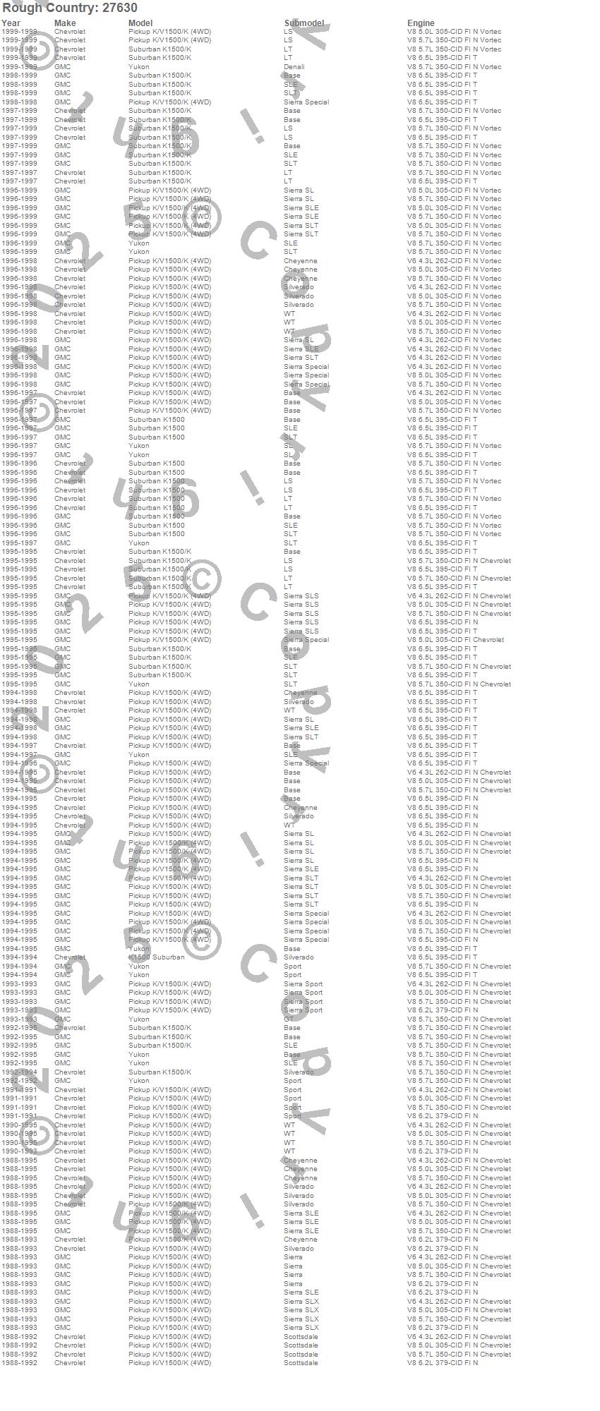 Below is an abbreviated list of applications for the Suspension Lift Kit.K1500, K1500 Pickup, K1500 Suburban, Yukon, Chevrolet, GMC, 1999, 1998, 1997, 1996, 1995, 1994, 1993, 1992, 1991, 1990, 1989, 1988